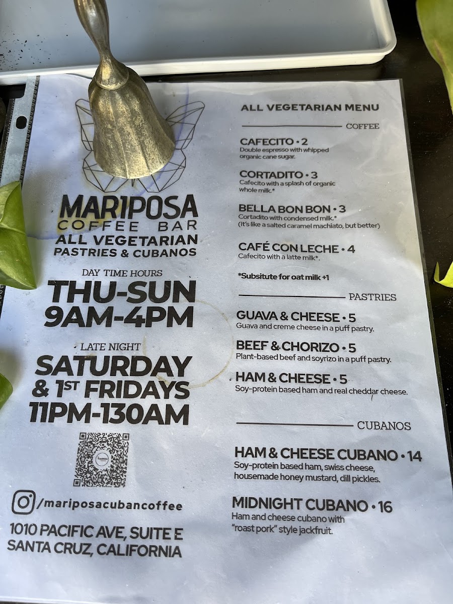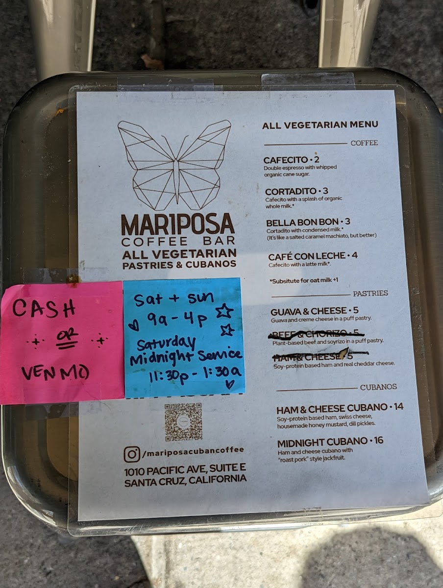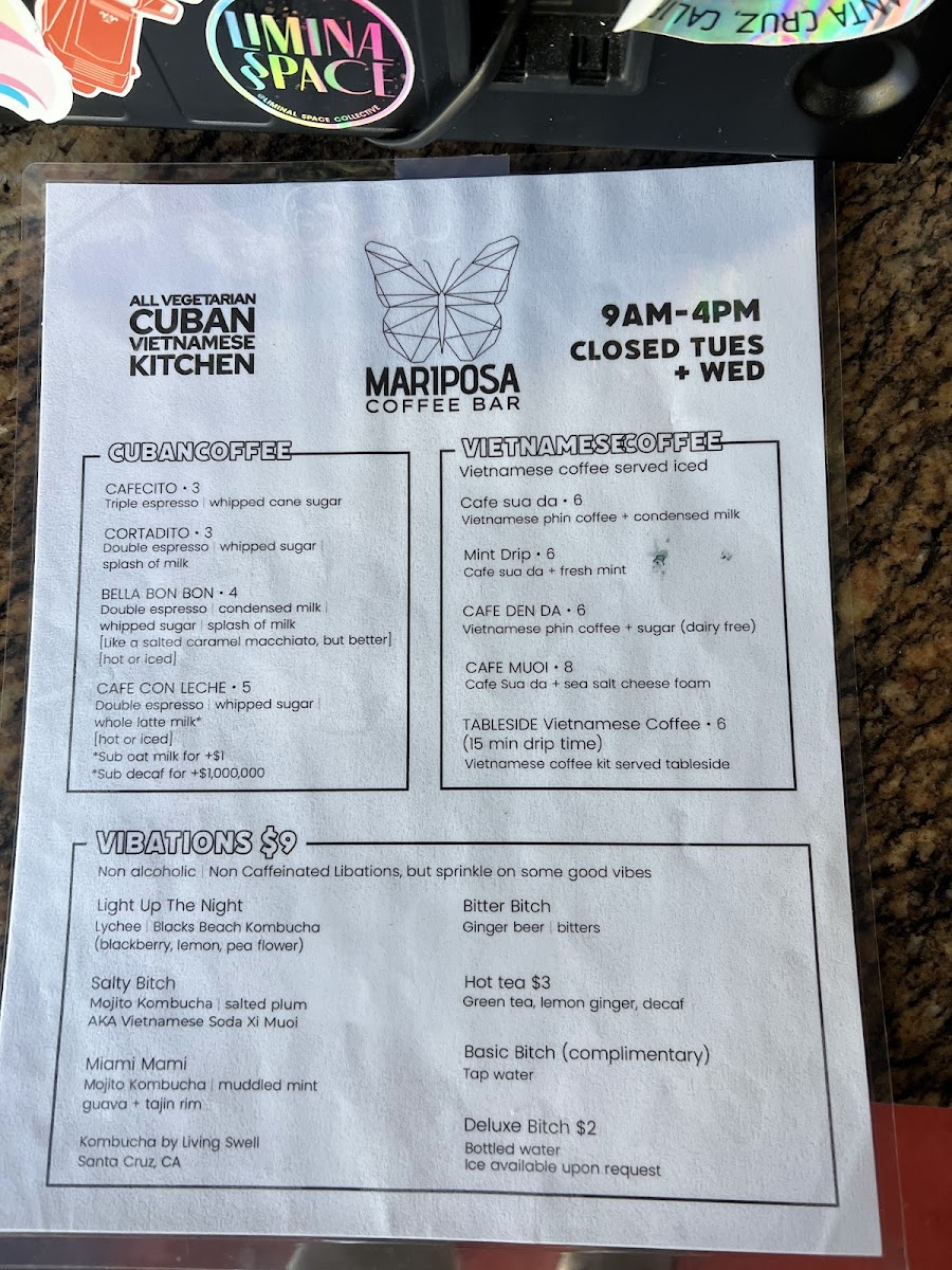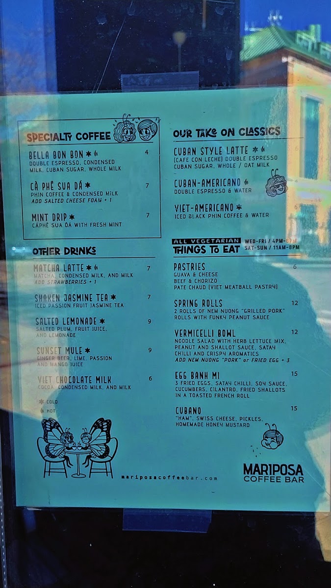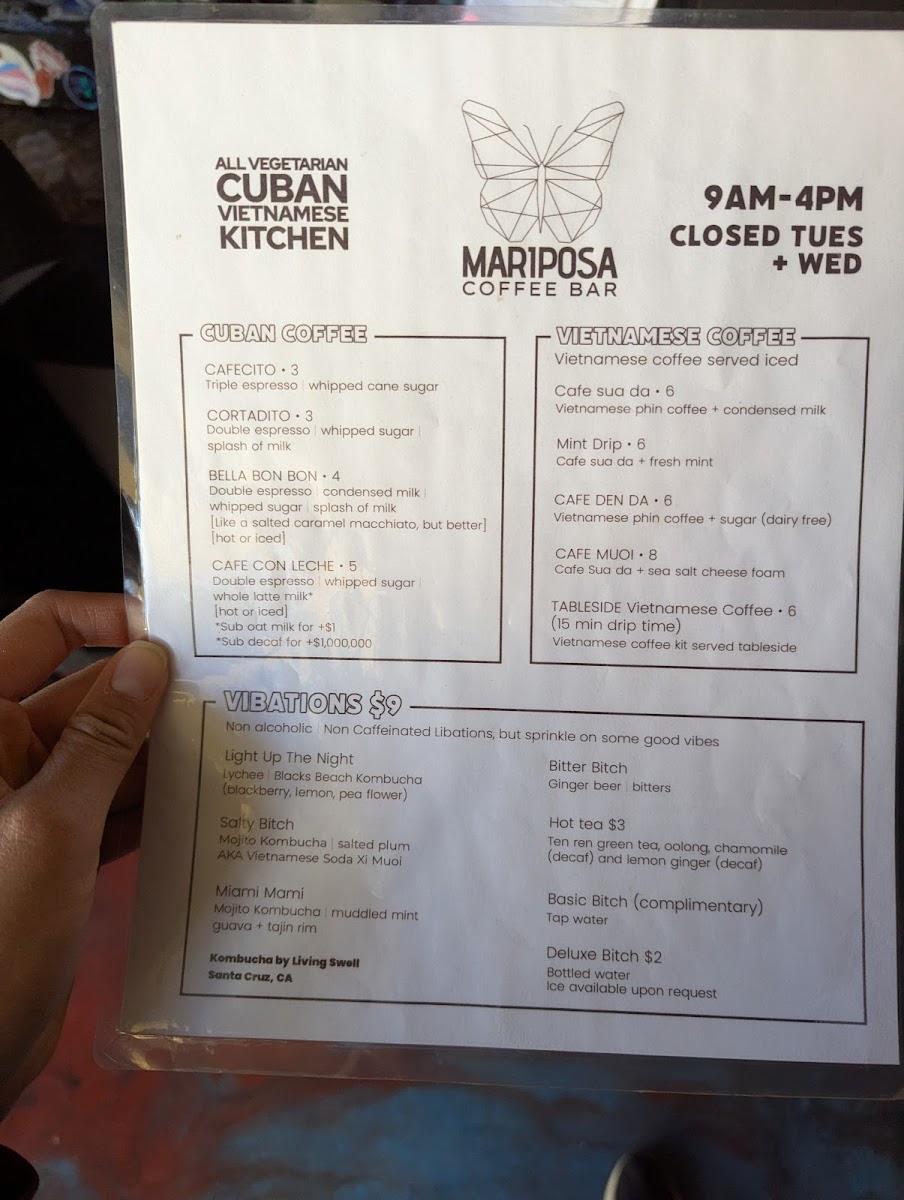 The menu at Mariposa Coffee Bar offers a delightful range of options, blending Vietnamese, Cuban, and other comforting dishes with unique beverages. For those craving Vietnamese flavors, try the Double Nem Nuong Spring Rolls or the hearty Banh Mi Op La. The Vermicelli Bowl is another refreshing choice. If you're in the mood for something more familiar, their French Bread Pepperoni and French Bread Veg pizzas are simple yet satisfying, with options like PepperoniCheese and Veg Of The Day available as well. For a light snack, the Pate Chaud or Guava & Cheese pastries provide a perfect bite. The drinks menu is equally diverse, with choices such as the rich Cafe Den Da and Cafe Sua Da from the Vietnamese Coffee section, or the indulgent Sua Cacao (Viet Hot Chocolate). The Cuban-American and Bella Bon Bon coffees offer a bold twist, while the refreshing Hot Lemon Ginger Tea and Hot Chamomille Tea cater to those seeking a soothing, decaf experience. Don’t forget to try the unique Salted Lemonade for a zesty kick or the Bitter Bitch non-alcoholic beverage for something different. Whether you're enjoying a quick bite or relaxing with a drink, Mariposa’s menu offers something for everyone.